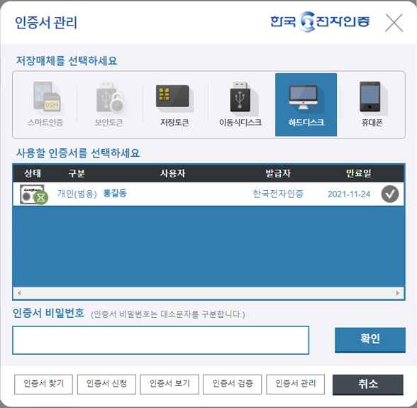 신원확인할 인증서를 선택하고 비밀번호를 입력 후 확인을 클릭합니다.