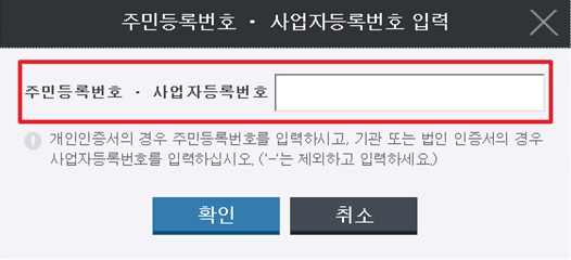 주민등록번호 또는 사업자등록번호를 입력한 후 확인을 클릭합니다.